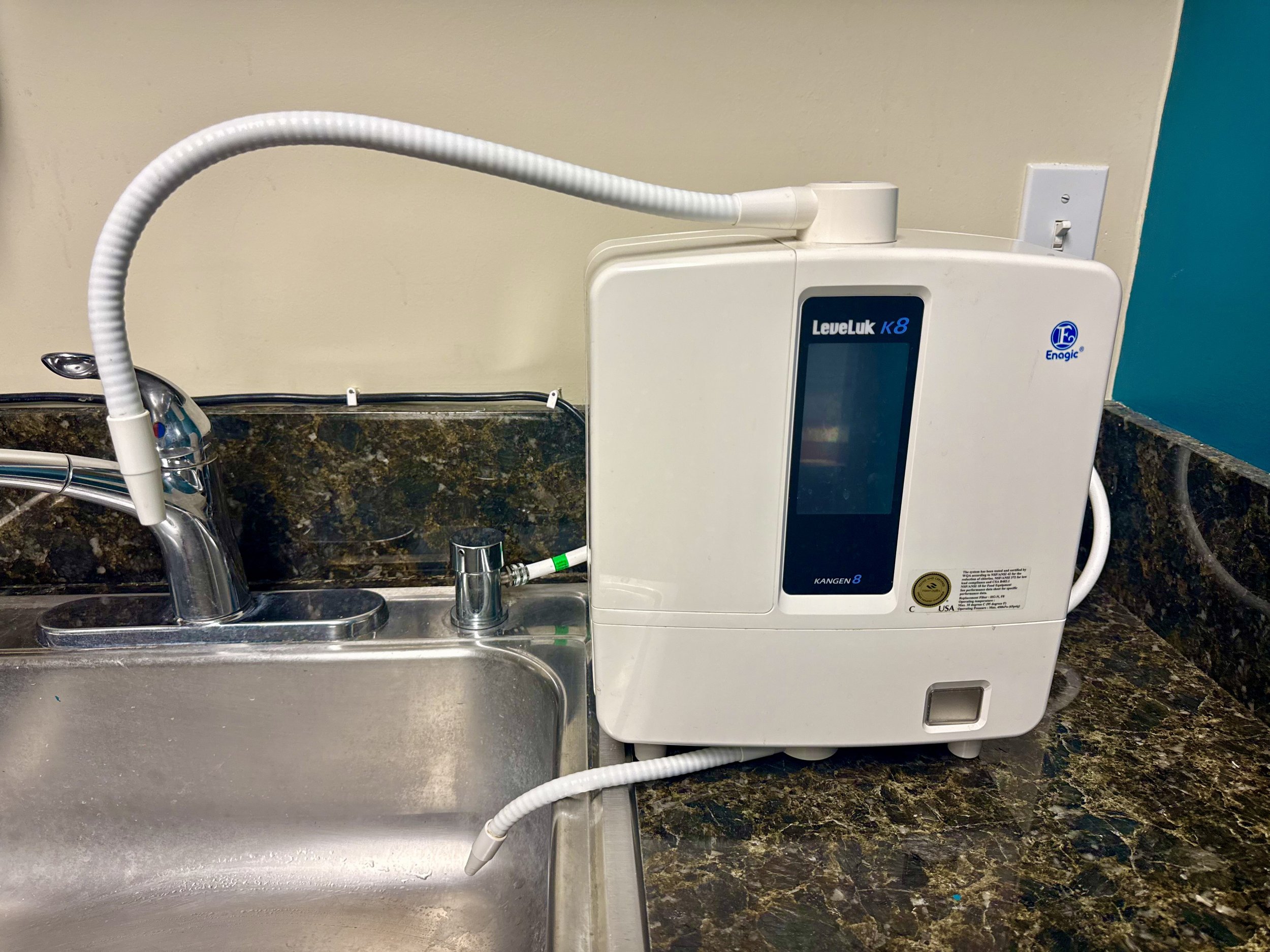 This system filters your tap water and transforms it through electrolysis into fresh, mineral rich, alkaline water on demand.
